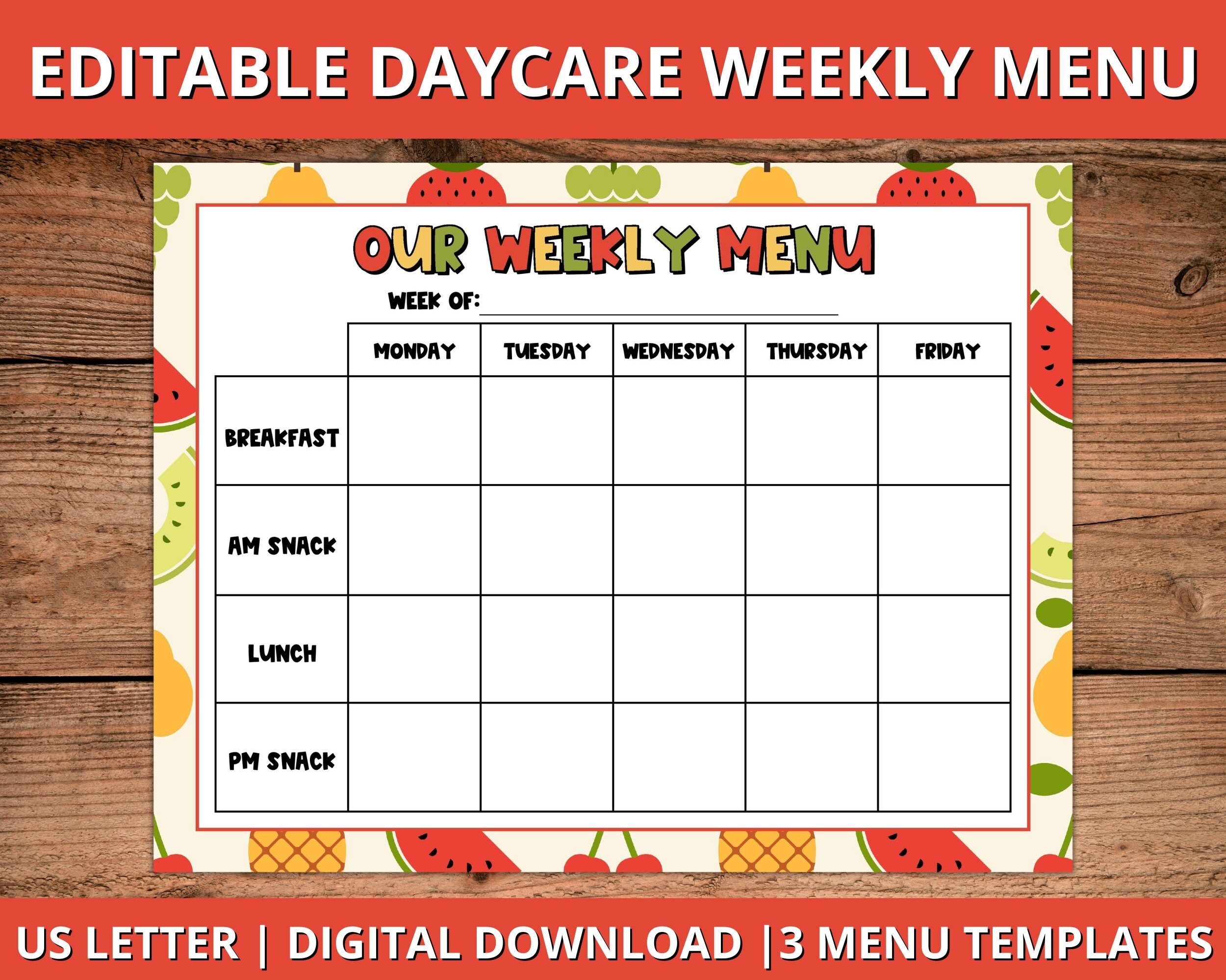 Editable Daycare Weekly Menu Editable Daycare Menu Fillable Daycare
