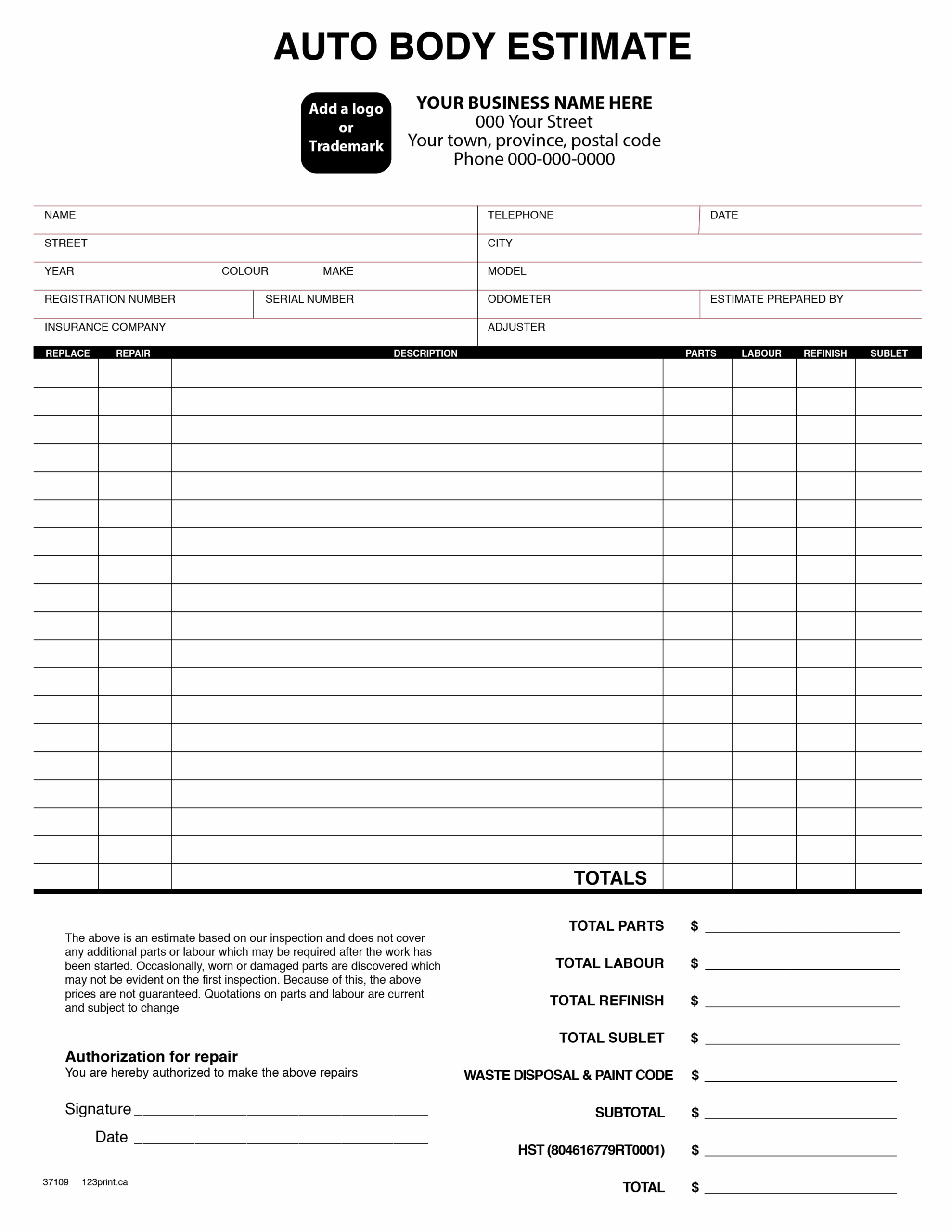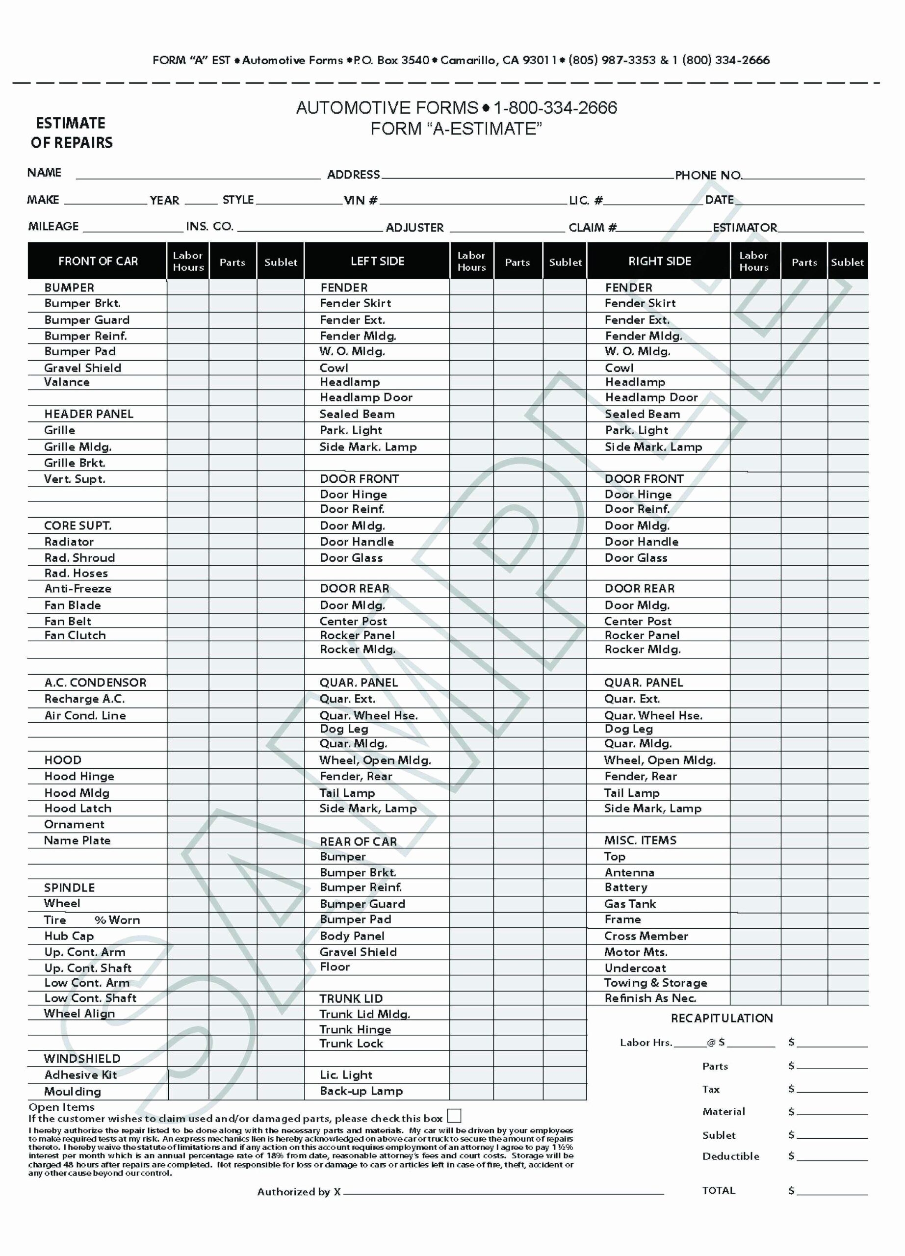 Printable Auto Body Repair Estimate Forms Printable Auto Body Repair